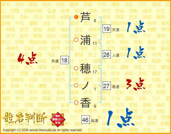 芦(8画)浦(11画) 穂(17画)ノ(1画)香(9画)