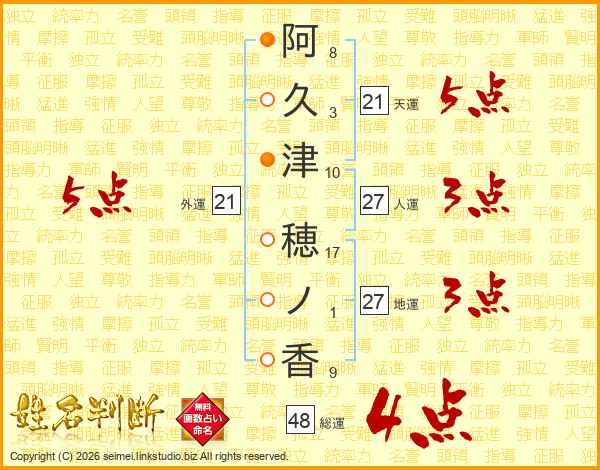阿(8画)久(3画)津(10画) 穂(17画)ノ(1画)香(9画)