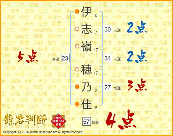 伊(6画)志(7画)嶺(17画) 穂(17画)乃(2画)佳(8画)