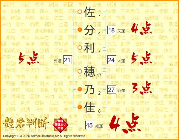 佐(7画)分(4画)利(7画) 穂(17画)乃(2画)佳(8画)