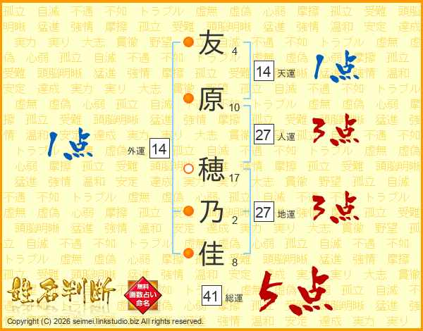 友(4画)原(10画) 穂(17画)乃(2画)佳(8画)