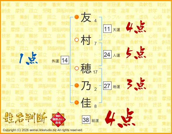 友村穂乃佳さんの総運は38画の4点!