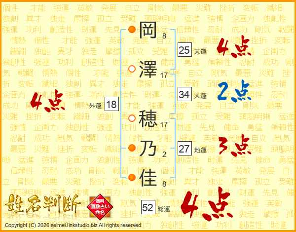 岡(8画)澤(17画) 穂(17画)乃(2画)佳(8画)