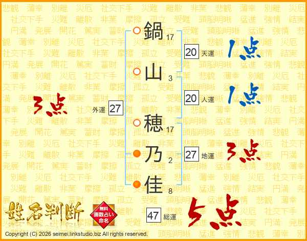 鍋(17画)山(3画) 穂(17画)乃(2画)佳(8画)