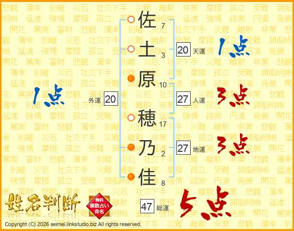 佐土原穂乃佳さんの総運は47画の5点!
