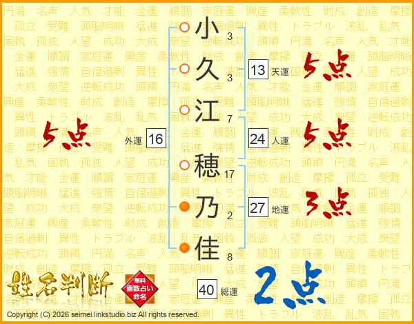 小(3画)久(3画)江(7画) 穂(17画)乃(2画)佳(8画)