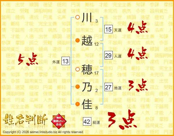 川(3画)越(12画) 穂(17画)乃(2画)佳(8画)