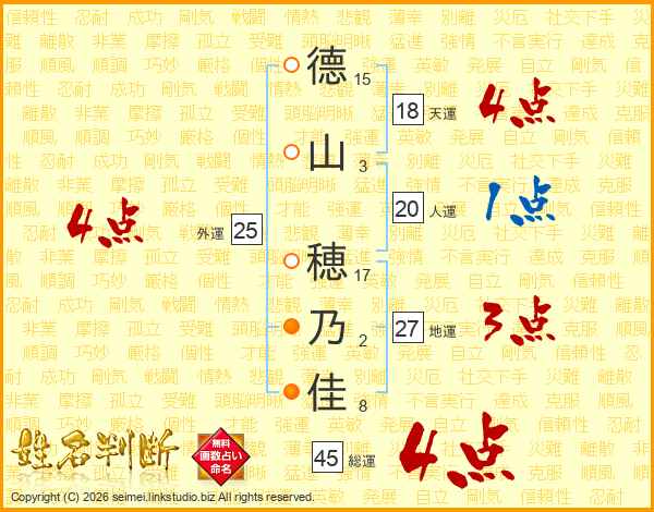 德(15画)山(3画) 穂(17画)乃(2画)佳(8画)