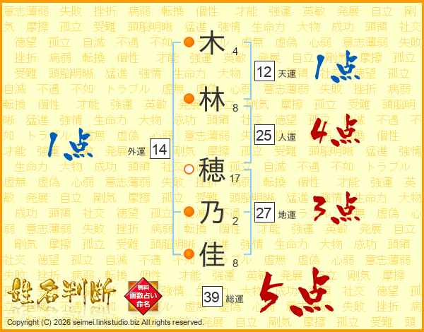 木(4画)林(8画) 穂(17画)乃(2画)佳(8画)