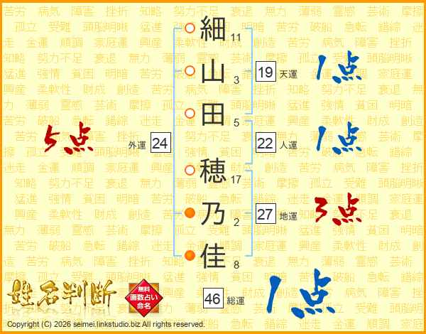 細(11画)山(3画)田(5画) 穂(17画)乃(2画)佳(8画)