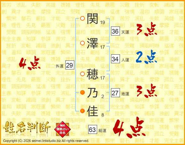 関(19画)澤(17画) 穂(17画)乃(2画)佳(8画)