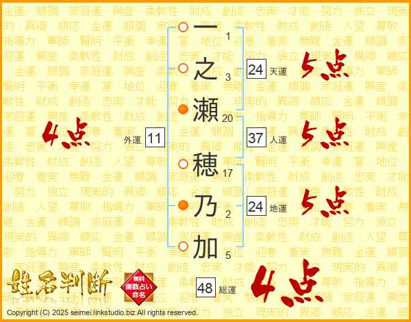 一(1画)之(3画)瀬(20画) 穂(17画)乃(2画)加(5画)
