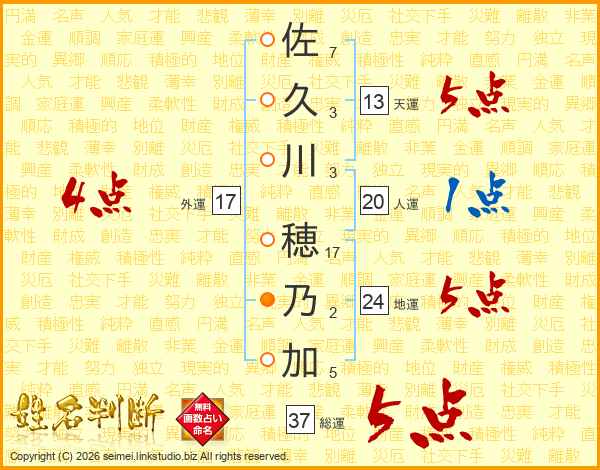 佐(7画)久(3画)川(3画) 穂(17画)乃(2画)加(5画)