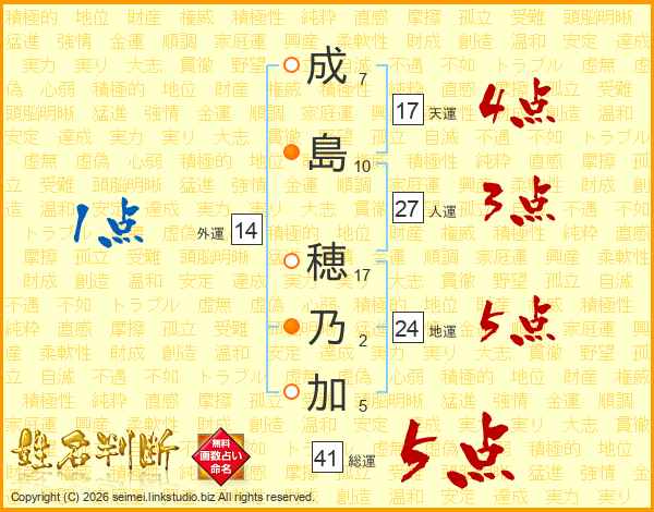 成(7画)島(10画) 穂(17画)乃(2画)加(5画)