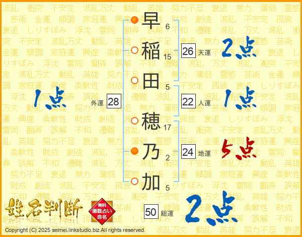 早(6画)稲(15画)田(5画) 穂(17画)乃(2画)加(5画)