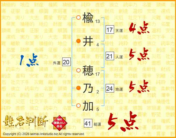 楡(13画)井(4画) 穂(17画)乃(2画)加(5画)