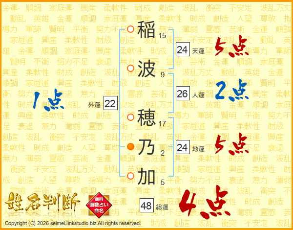 稲(15画)波(9画) 穂(17画)乃(2画)加(5画)
