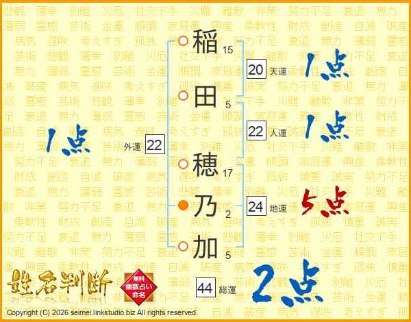 稲(15画)田(5画) 穂(17画)乃(2画)加(5画)