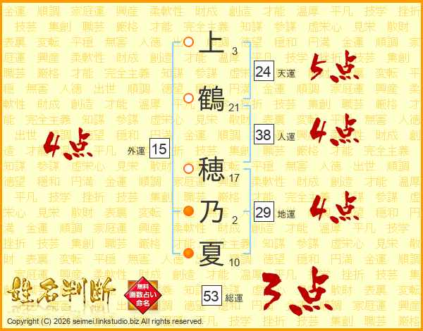 上(3画)鶴(21画) 穂(17画)乃(2画)夏(10画)