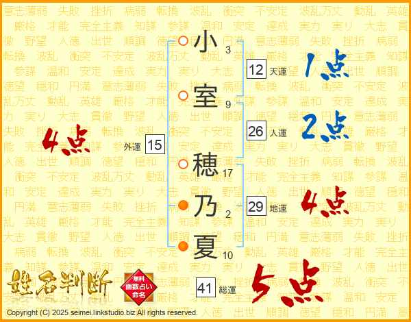 小(3画)室(9画) 穂(17画)乃(2画)夏(10画)