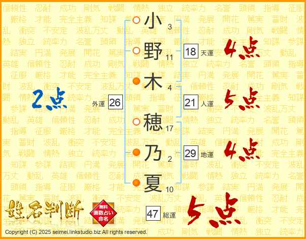 小野木穂乃夏さんの総運は47画の5点!