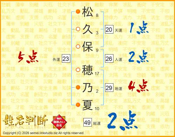 松(8画)久(3画)保(9画) 穂(17画)乃(2画)夏(10画)