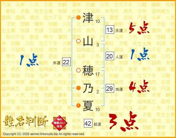 津(10画)山(3画) 穂(17画)乃(2画)夏(10画)