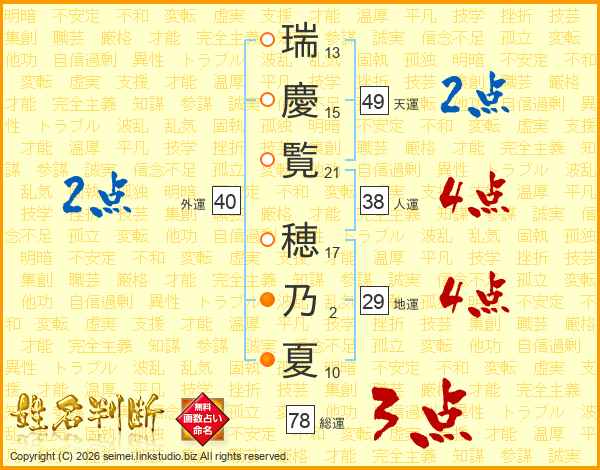 瑞(13画)慶(15画)覧(21画) 穂(17画)乃(2画)夏(10画)