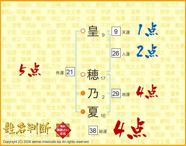 皇穂乃夏さんの総運は38画の4点!