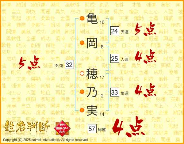 亀(16画)岡(8画) 穂(17画)乃(2画)実(14画)