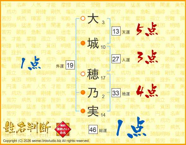 大(3画)城(10画) 穂(17画)乃(2画)実(14画)