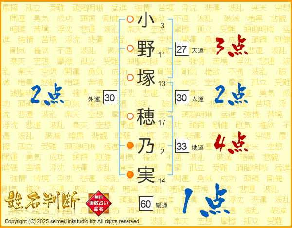 小(3画)野(11画)塚(13画) 穂(17画)乃(2画)実(14画)