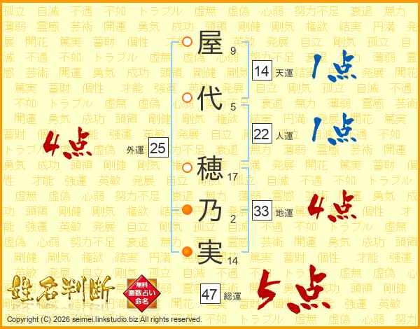 屋(9画)代(5画) 穂(17画)乃(2画)実(14画)