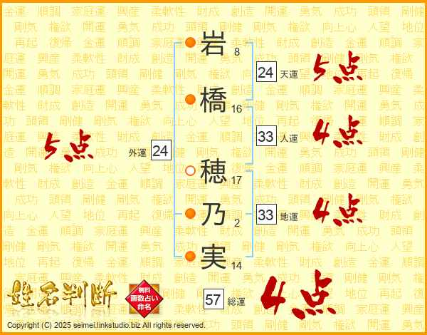 岩(8画)橋(16画) 穂(17画)乃(2画)実(14画)