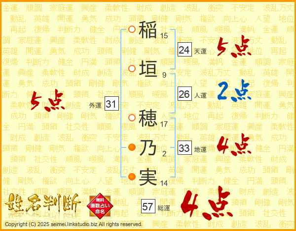 稲(15画)垣(9画) 穂(17画)乃(2画)実(14画)