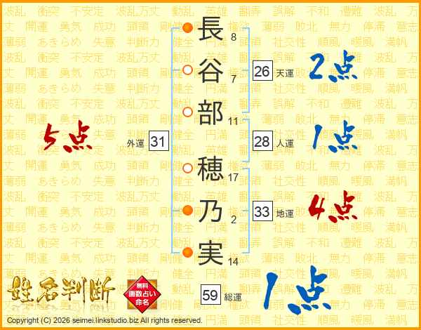 長(8画)谷(7画)部(11画) 穂(17画)乃(2画)実(14画)