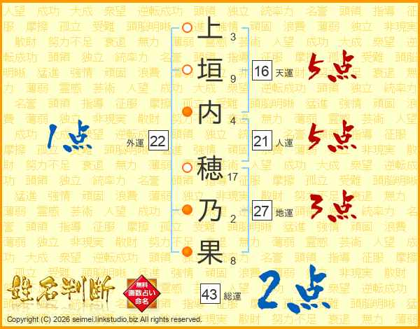 上(3画)垣(9画)内(4画) 穂(17画)乃(2画)果(8画)