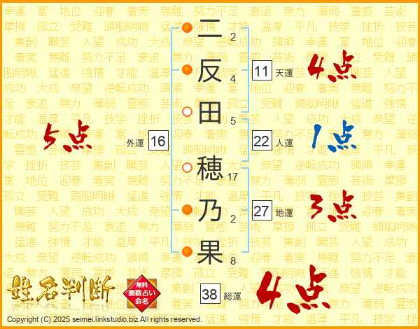 二(2画)反(4画)田(5画) 穂(17画)乃(2画)果(8画)