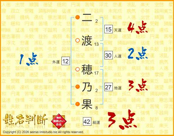 二(2画)渡(13画) 穂(17画)乃(2画)果(8画)