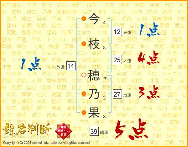 今(4画)枝(8画) 穂(17画)乃(2画)果(8画)