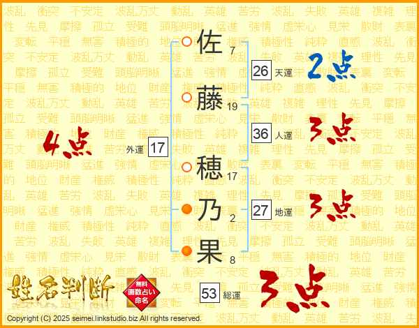 佐(7画)藤(19画) 穂(17画)乃(2画)果(8画)