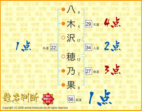八(8画)木(4画)沢(17画) 穂(17画)乃(2画)果(8画)
