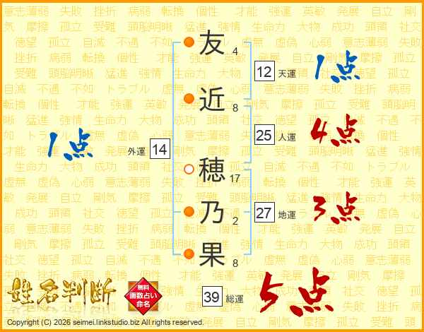 友(4画)近(8画) 穂(17画)乃(2画)果(8画)