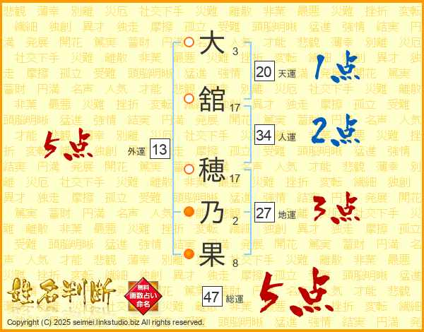 大(3画)舘(17画) 穂(17画)乃(2画)果(8画)