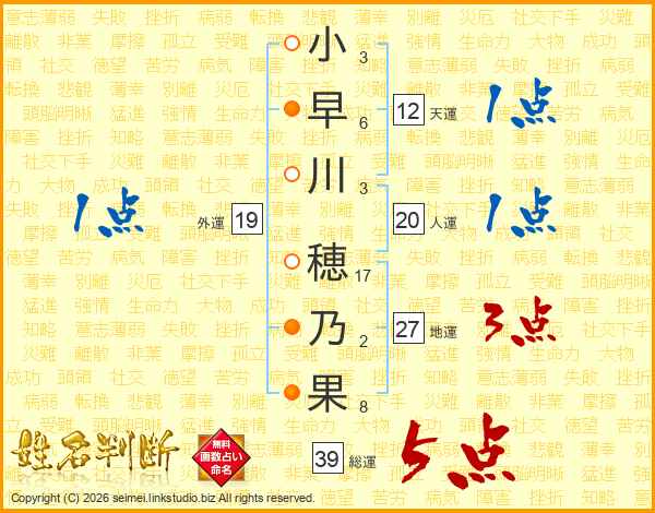 小(3画)早(6画)川(3画) 穂(17画)乃(2画)果(8画)