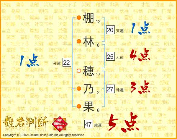 棚(12画)林(8画) 穂(17画)乃(2画)果(8画)