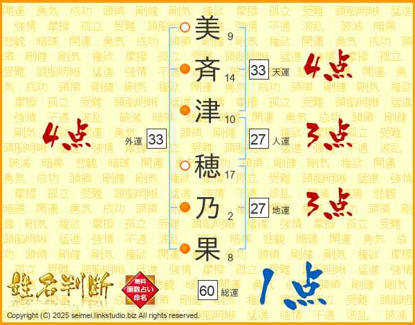 美(9画)斉(14画)津(10画) 穂(17画)乃(2画)果(8画)