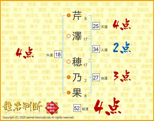 芹(8画)澤(17画) 穂(17画)乃(2画)果(8画)