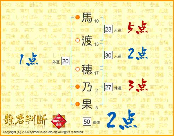 馬(10画)渡(13画) 穂(17画)乃(2画)果(8画)