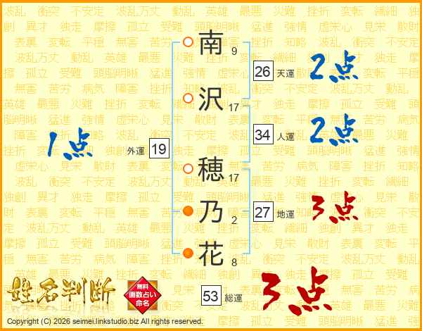 南(9画)沢(17画) 穂(17画)乃(2画)花(8画)